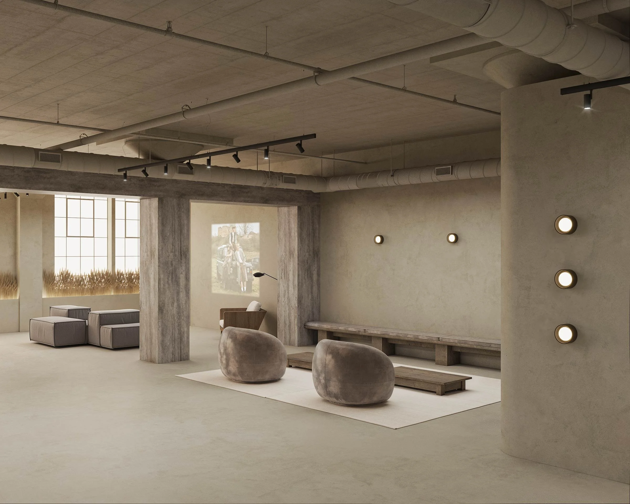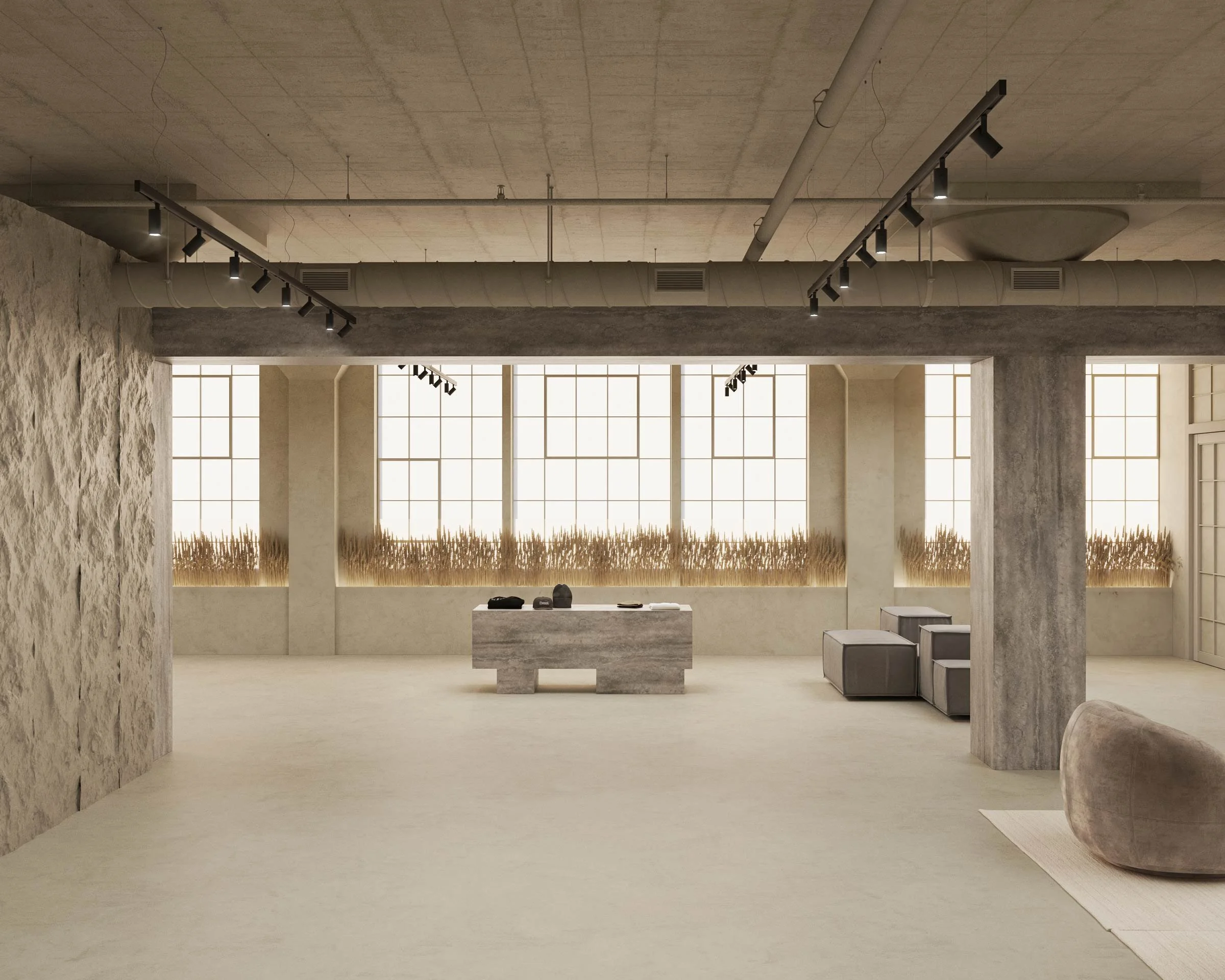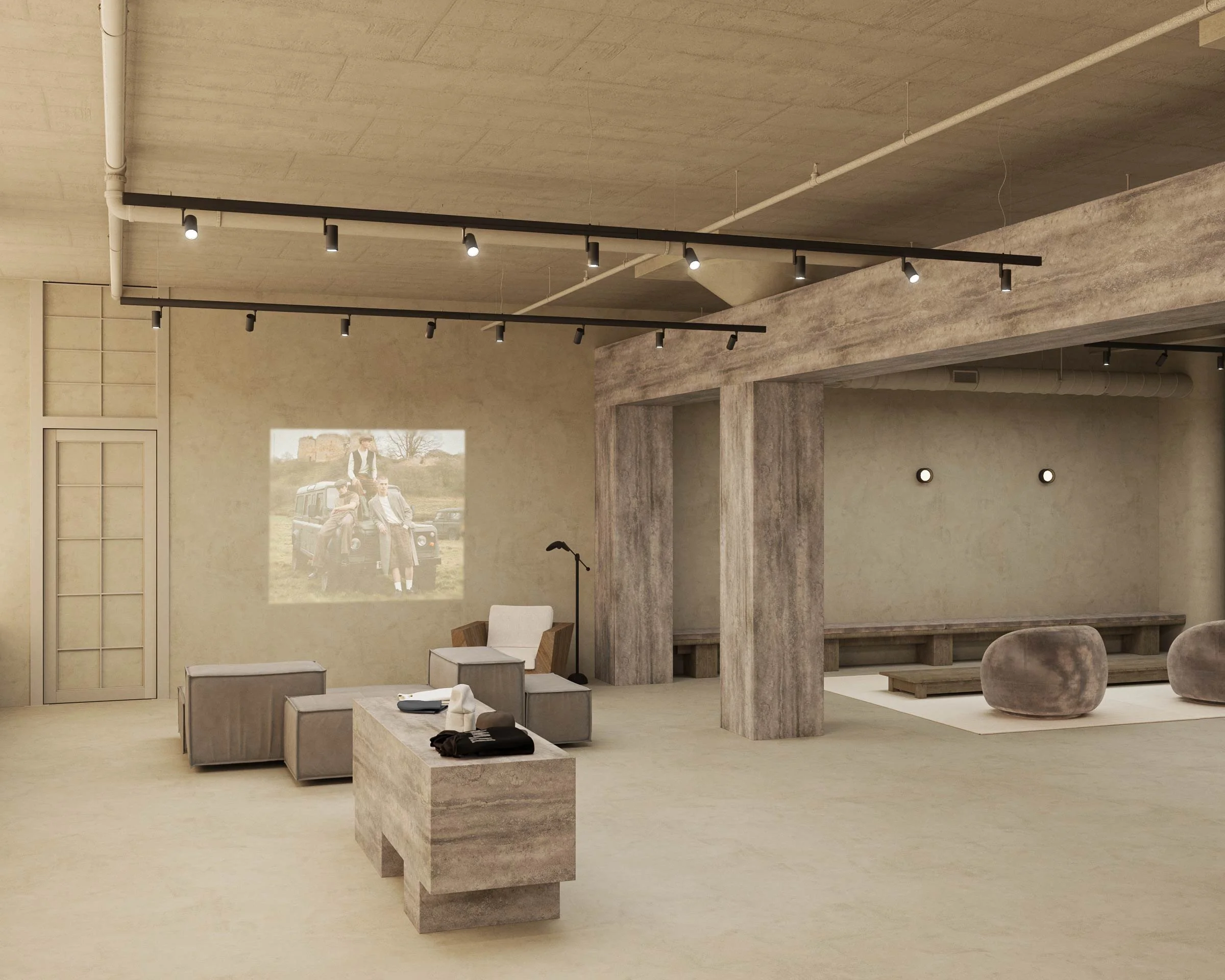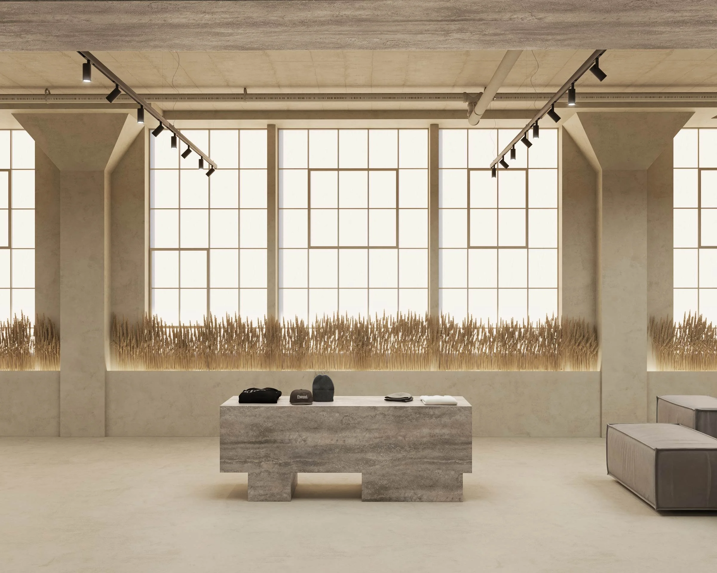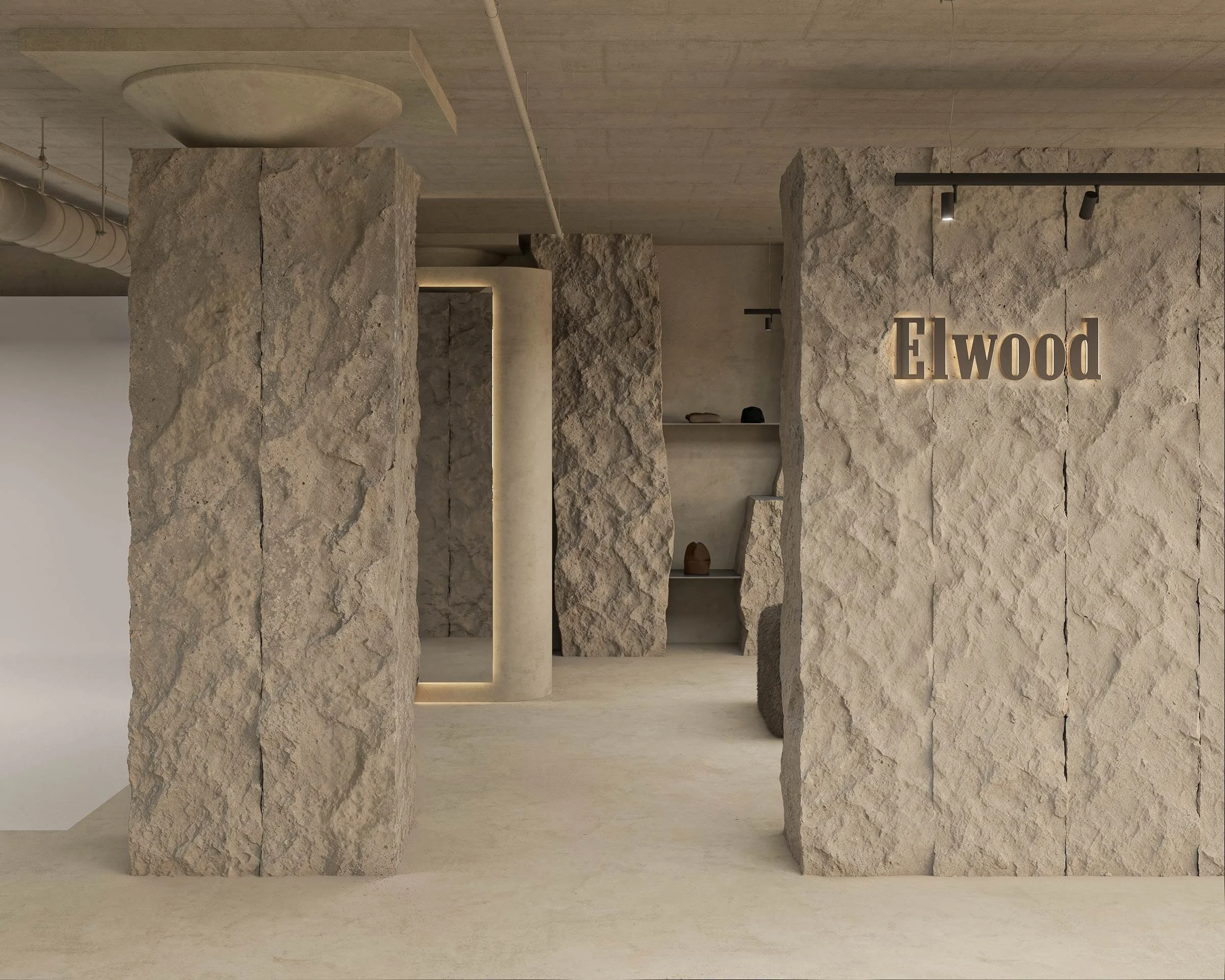 Blending rough concrete texture with custom travertine beams, creating a raw yet refined architectural rhythm. one of the main challenges was integrating the existing photography cyc wall seamlessly into the layout, allowing it to feel intentional rather than separate. sculpted surfaces and warm lighting frame the elwood identity, merging function, material honesty, and brand storytelling.
