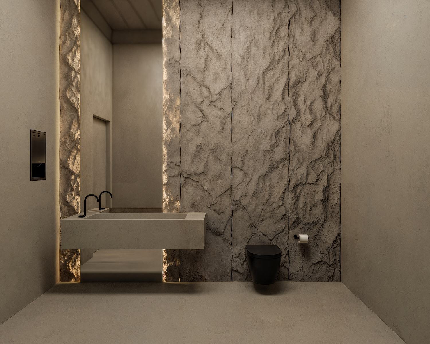 A calm, immersive space where light is softened through diffused windows, allowing the focus to remain inward. custom travertine consoles and the stone register ground the room, while warm wheat grass planters add a subtle americana contrast. the mix of sculpted walls, concrete, and steel creates a refined balance between texture, utility, and quiet luxury.