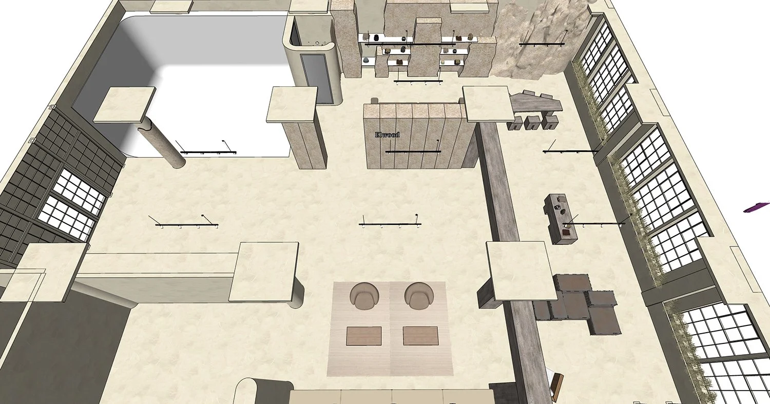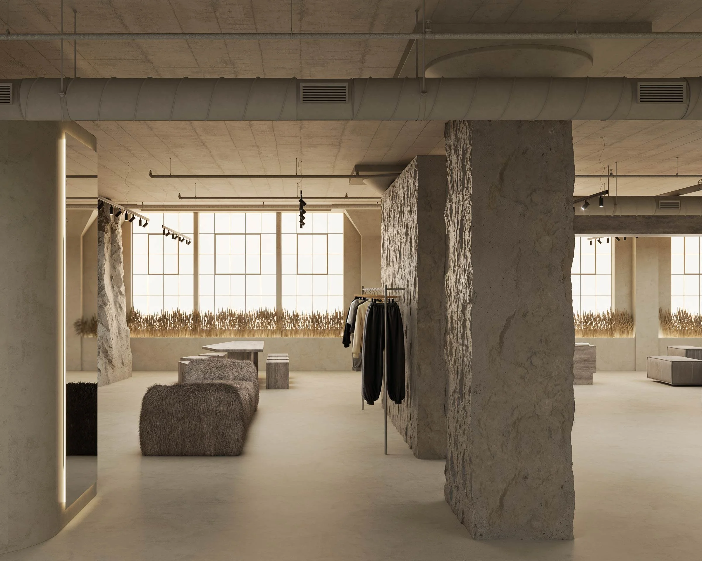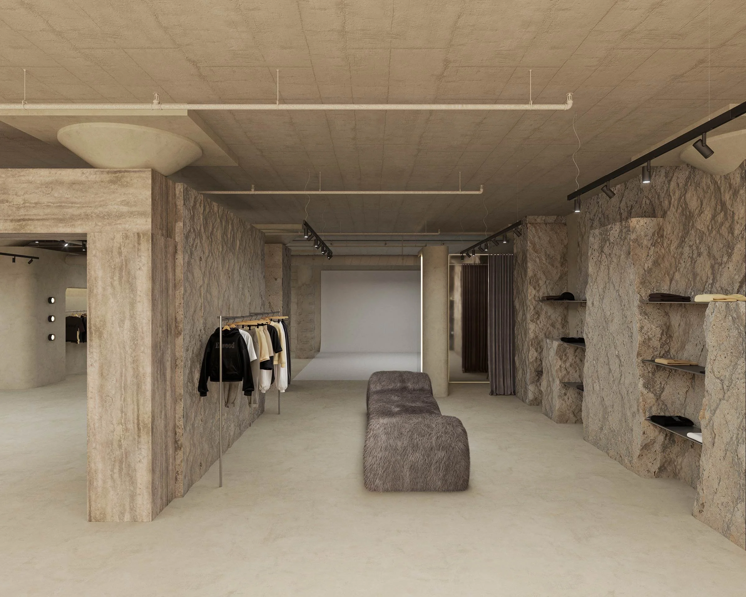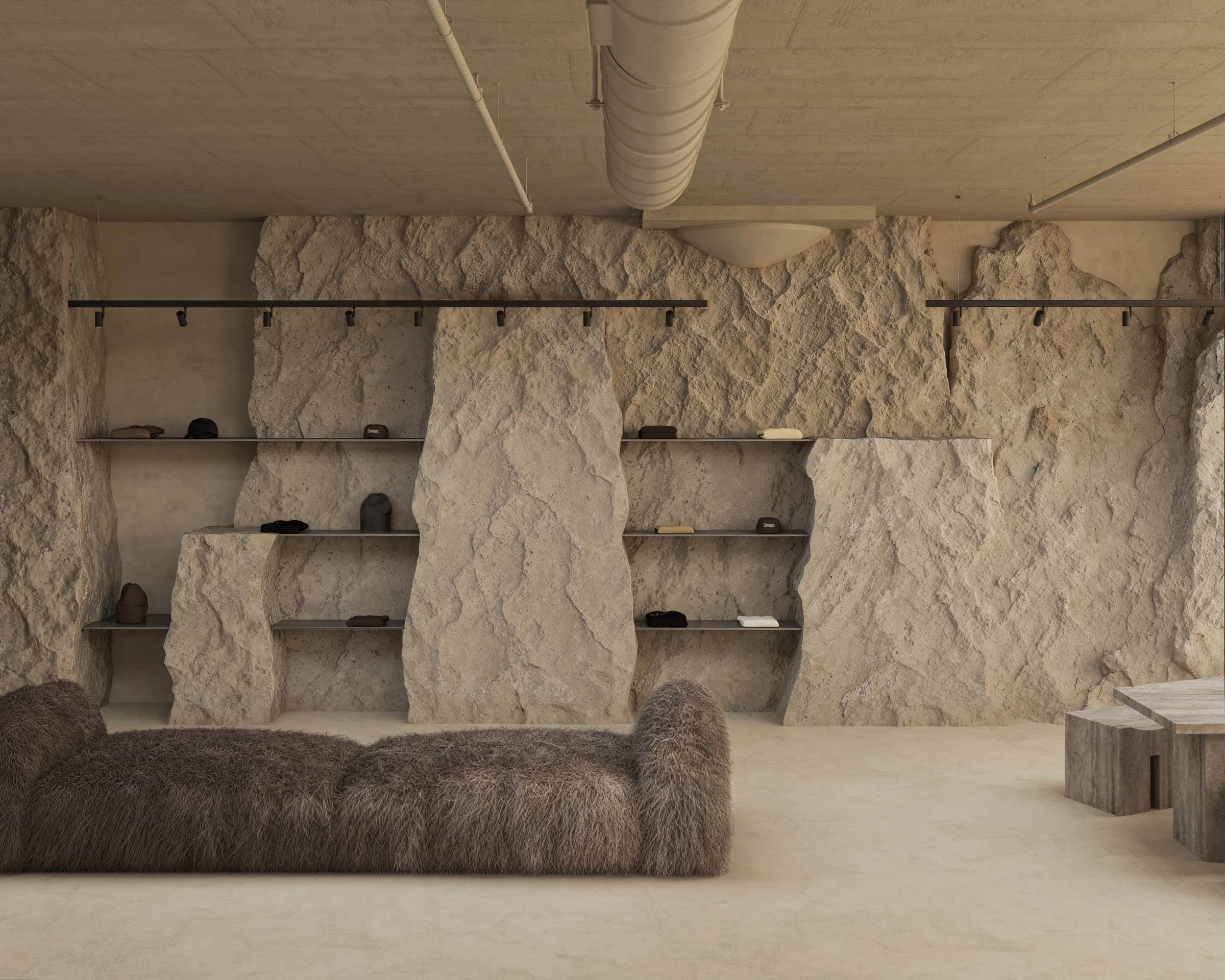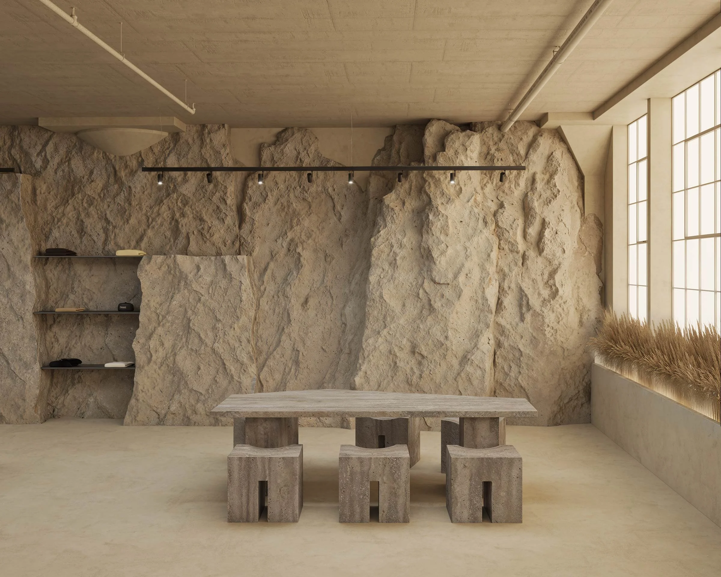 An immersive retail studio anchored by custom stonework and sculpted, rippled walls. travertine tables and plinths ground the room, while concrete structure and slim black track lights add clarity. softened seating and inset shelving weave utility into warmth. the palette feels raw, refined, and quietly american-outdoors inspired through honest materials.