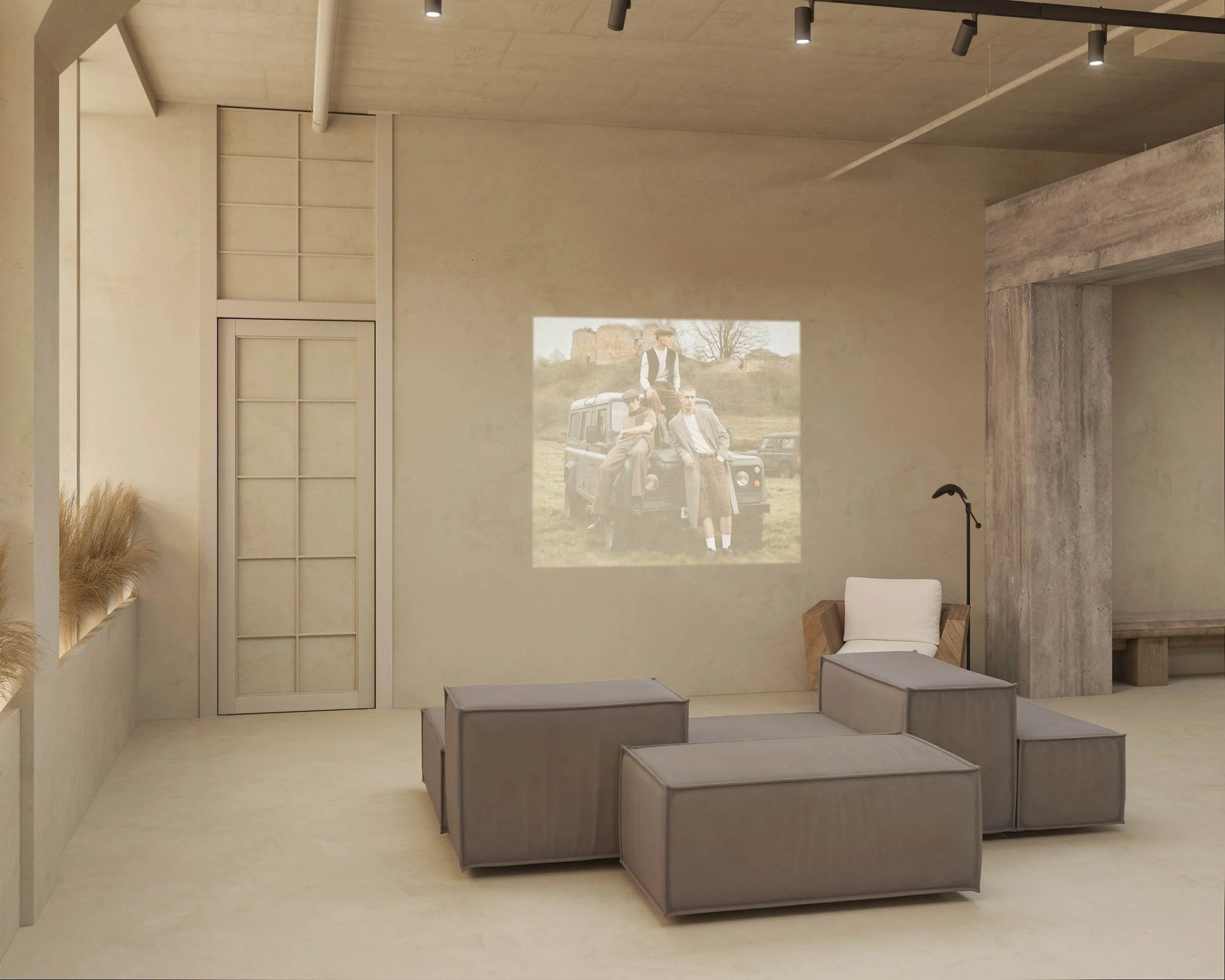 Modular, custom-upholstered seating with sharp tailoring, offering flexibility for collaborative discussions. A seamless AV projection wall enhances campaign presentations, blending aesthetics and functionality for an immersive experience tailored to staff and clients